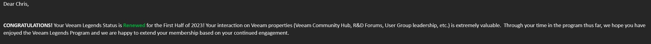 I received a great surprise in my email from Madalina Cristil ( @MadiCristil), the manager of the Veeam Community Legends program, Rick Vanover ( @rickvanover), Safiya Mohamed ( @safiya), and Nikola Pejkova ( @NikolaPejkova) I was renewed into the 2023 first intake.