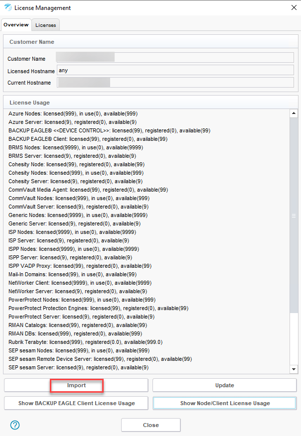 After you import the license XML file, you will see the products you are licensed for in the dialog. My license is an NFR with all available products, so there is more to the list, like Veeam, etc., below SEP. The next step is adding servers for the licensed products to your console. To that, we click again on the Settings menu and select Server and Device Management. This will bring up a dialog showing licensing in the top part of the window and the servers you add in the bottom half.