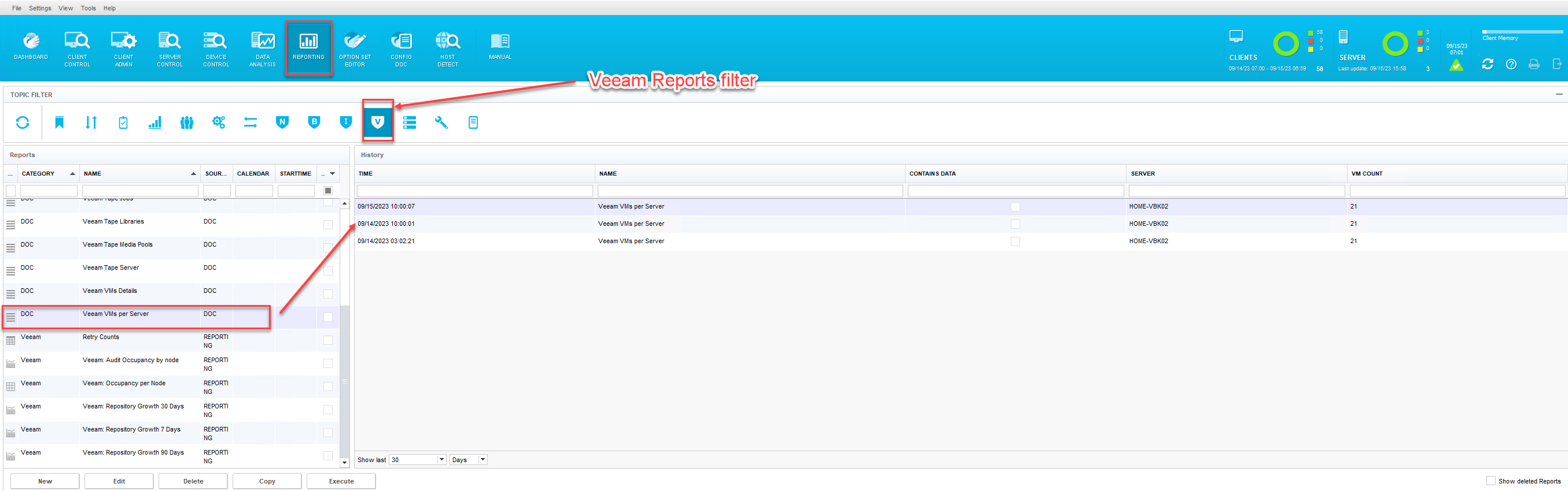 When you are in the console, you click the Reporting button in the ribbon, and then you can filter reports based on Veeam by clicking the “V” icon. This will bring up anything Veeam-related and show you Documents (DOC) and Reports you can schedule and run. Below is the console showing the reports and also a sample document. While I am just touching on the Reporting tab, there is so much more you can do with it when using multiple products that Backup Eagle supports.