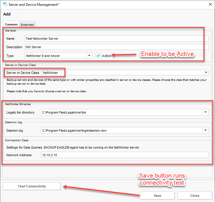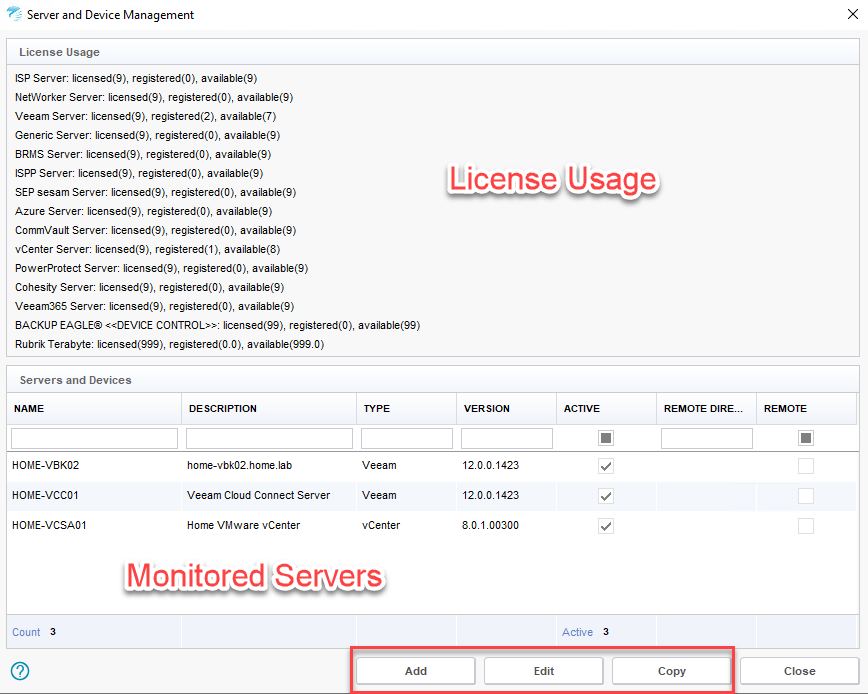At the screen above, you click the Add button, which brings up a dialog to enter information regarding the device you will monitor and what type it is based on your licensing. Once done, Save the new device/server, which conducts a connectivity test, and click the Close button. Your device/server now shows up in the dialog for Server and Device Management; you can click Close.