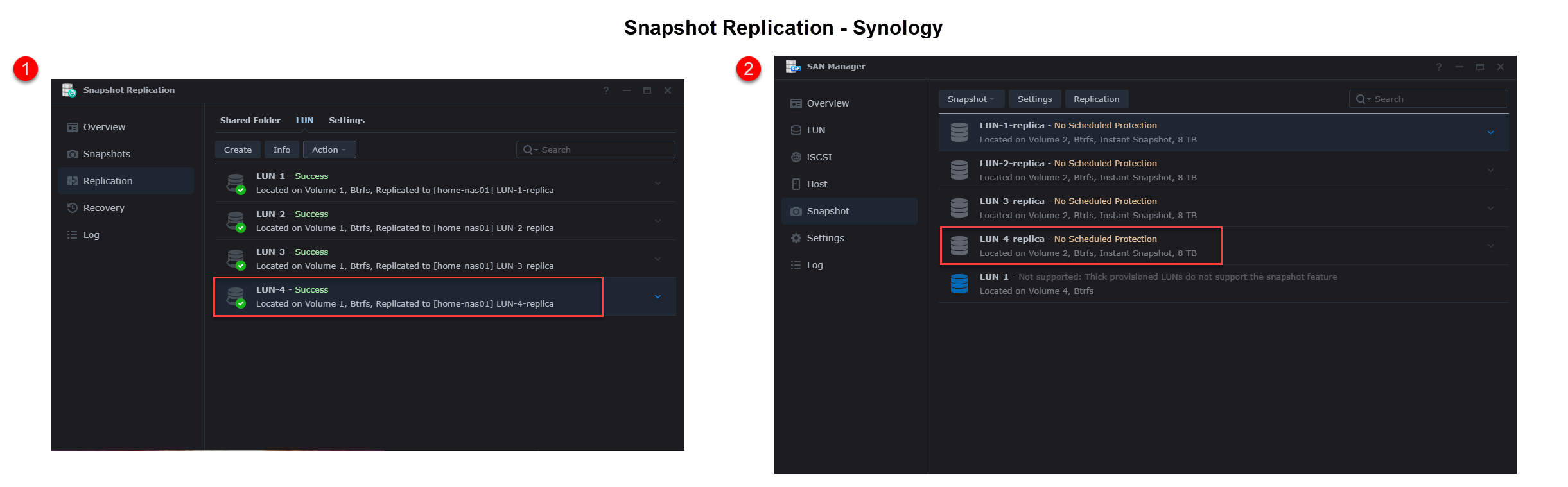 After you click Done on the final confirmation settings dialog this will then set up and begin the replication process for you new LUN(s). Mine did not take long as there is currently nothing on it as I created a new one specifically for this blog. Once the replication completes you can then check both the source and destination Synology devices to see the newly created LUN with replication completed.