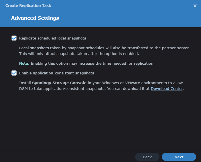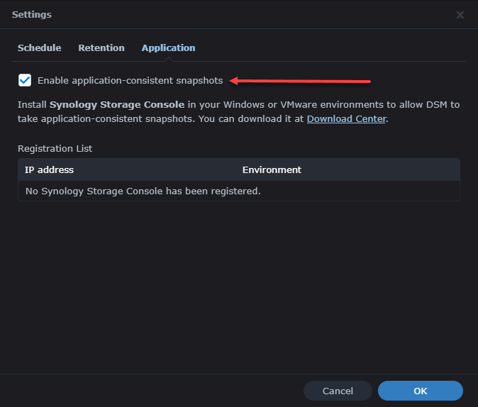 - Application - this allows application consistent snapshots but requires the Synology Storage Console within your VMware environment