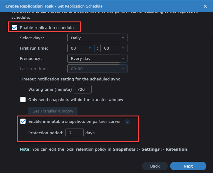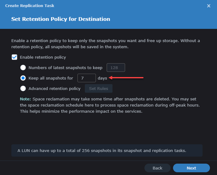 - Destination Retention - typically I set the same as the snapshot retention