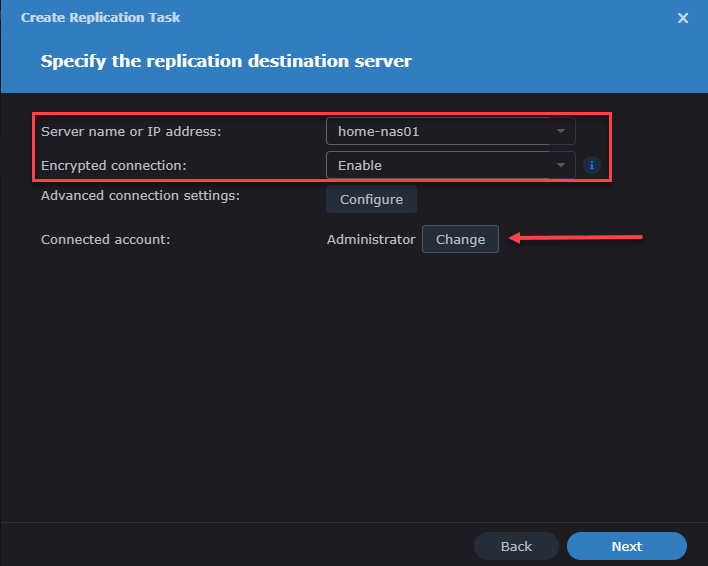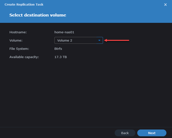 Click again on your new LUN highlighting it and then click the Replication button, which opens the Replication dialog where you will use the Create button to set up a new replication to your target Synology for the new LUN.