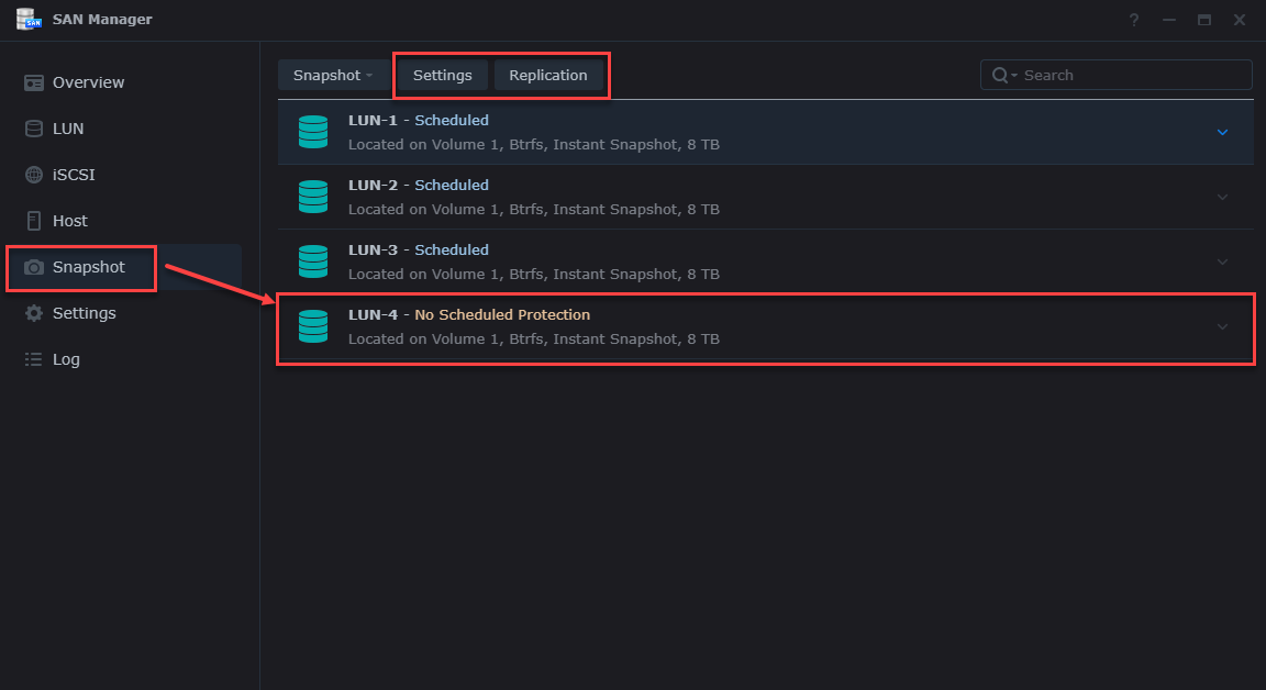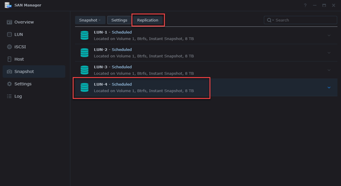 After you have set all the required details for your snapshots you click the OK button at the bottom of the Settings dialog to apply your new schedule, retention and application settings. We have now set up a new LUN with snapshots, which includes Immutability as well. Now let’s take a look at how we configure Replication to a partner Synology NAS using once again the SAN Manager and the Replication button.