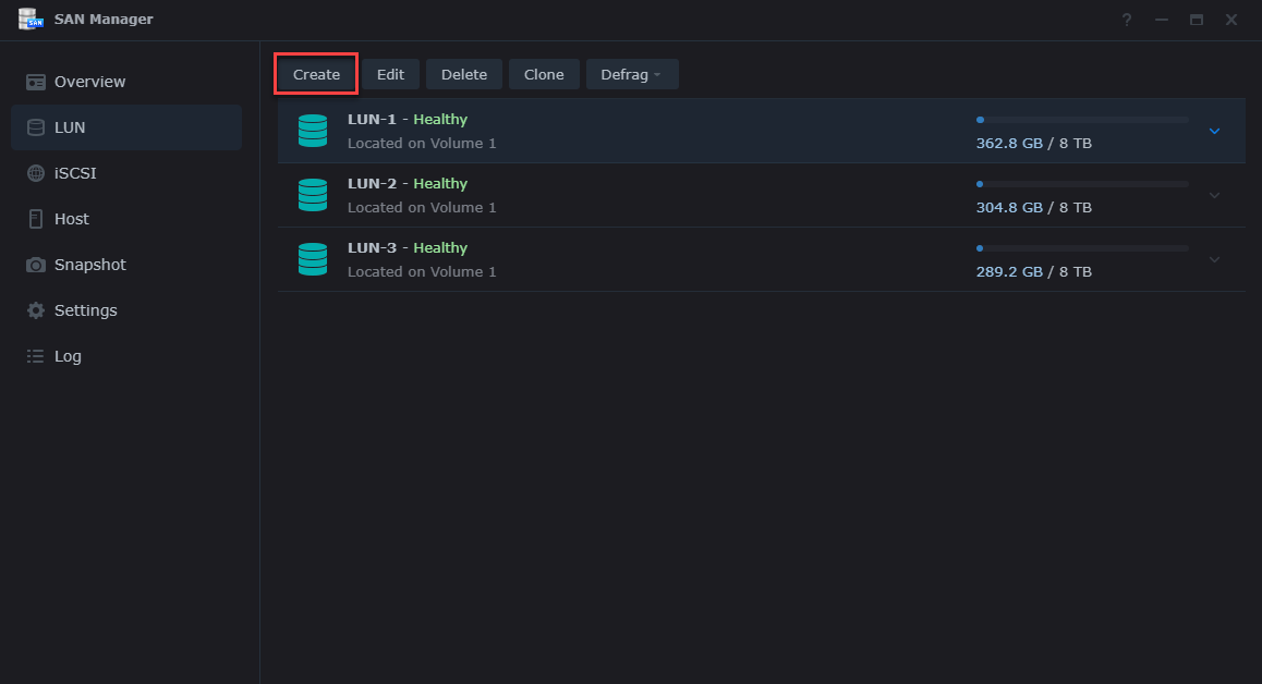 In order to configure storage snapshots with Immutability you first need to create a LUN within the SAN Manager application on the web UI. Launch the web UI and log in, from the main screen open SAN Manager and use the Create button to begin the process to create a new LUN.