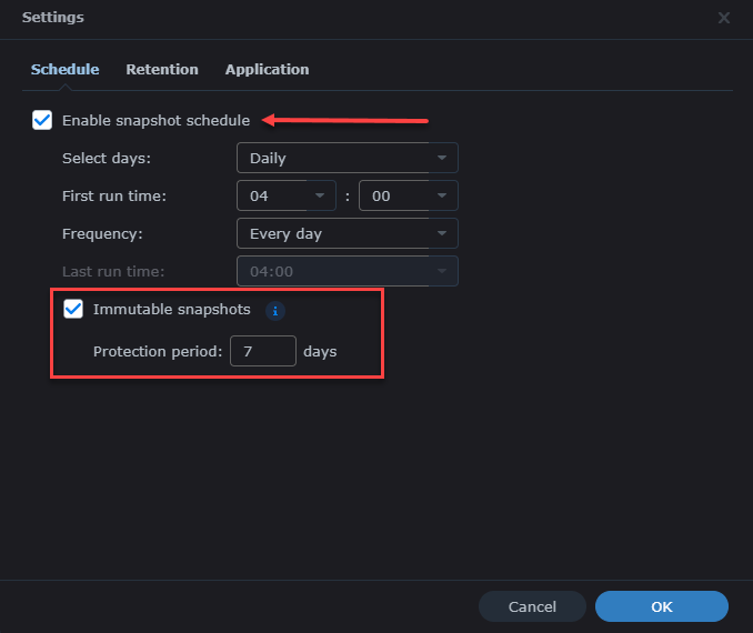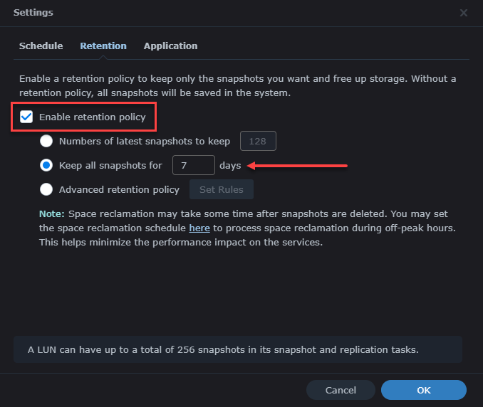 - Retention - this is where you set up the retention period for your snapshots - how long and how many you want to keep