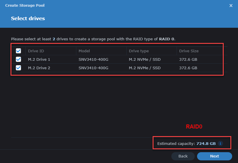 **NOTE: I am using RAID0 as I wanted to maximize the 400GB SSD drives I have in my DS923+. You typically would have larger supported drives and do a RAID1 for protection.**