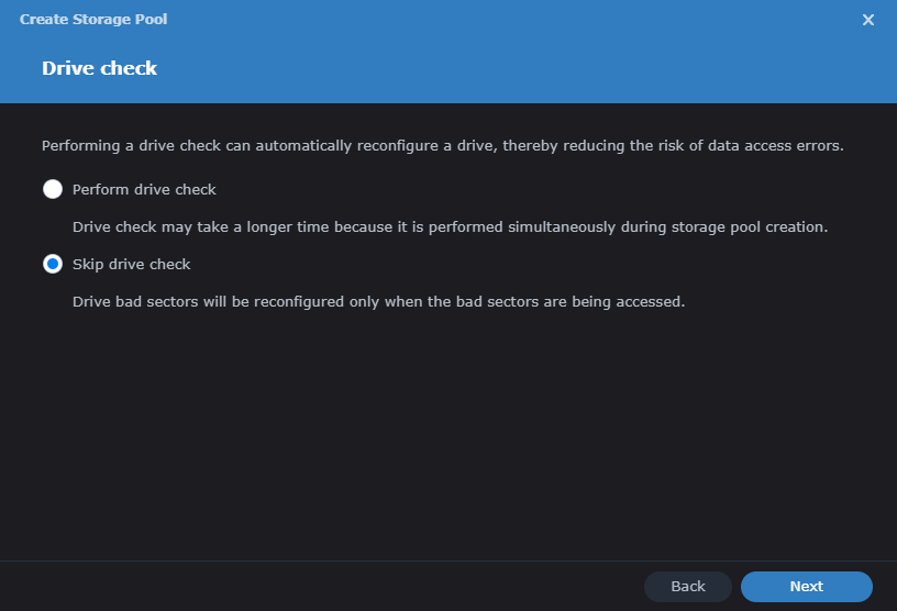 - Drive Check - whether to enable drive checking while it creates the Storage Pool - I selected not to check since the NAS is still fairly new