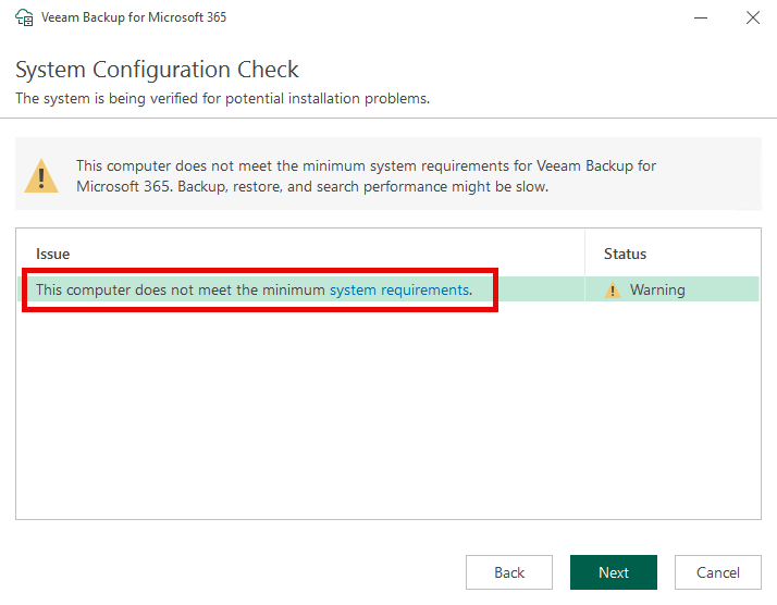- A system configuration check will happen to ensure your system meets the specified requirements for installation and if not then you are shown message about potential issues. In my case the system I installed on did not have the recommended CPU or RAM requirements for the new version, which is 8 vCPU and 16GB of RAM minimum as noted here - Veeam VB365 - System Requirements