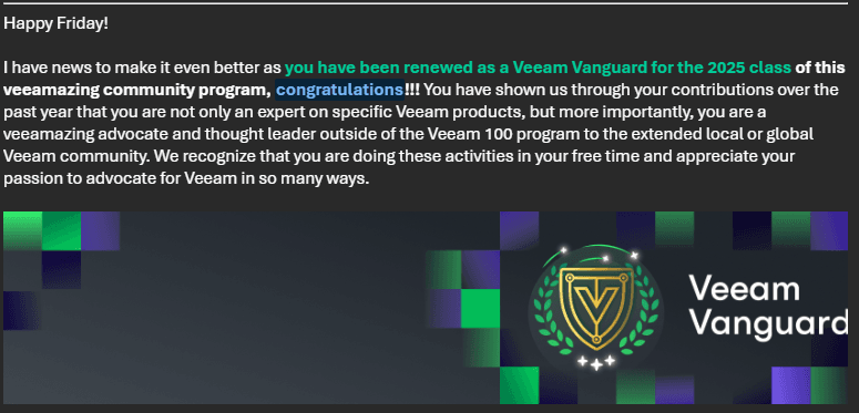 The program began in 2015, just after VeeamON 2017 in New Orleans, and I started my journey in the Veeam world and this great program. I want to thank Veeam, the Veeam Vanguard Program, Rick Vanover, Nikola Pejková, Madalina Cristil, Safiya Mohamed, and fellow 2025 Veeam Vanguards who make this program the best!